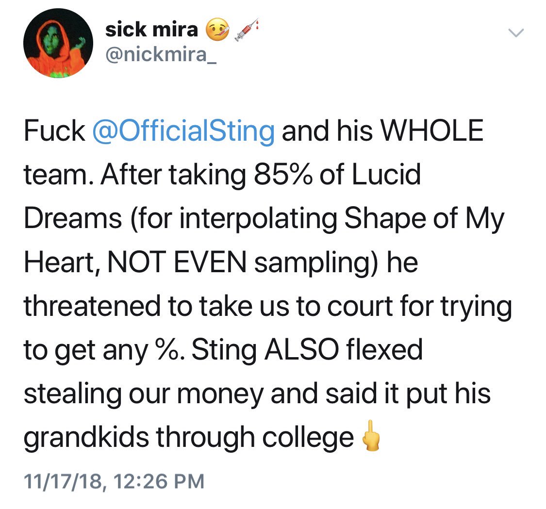찾아보니까 Sting이 Lucid Dreams 곡으로 소송을 걸어서 곡의 수익의 85%를 가지게 됐다고 하네요